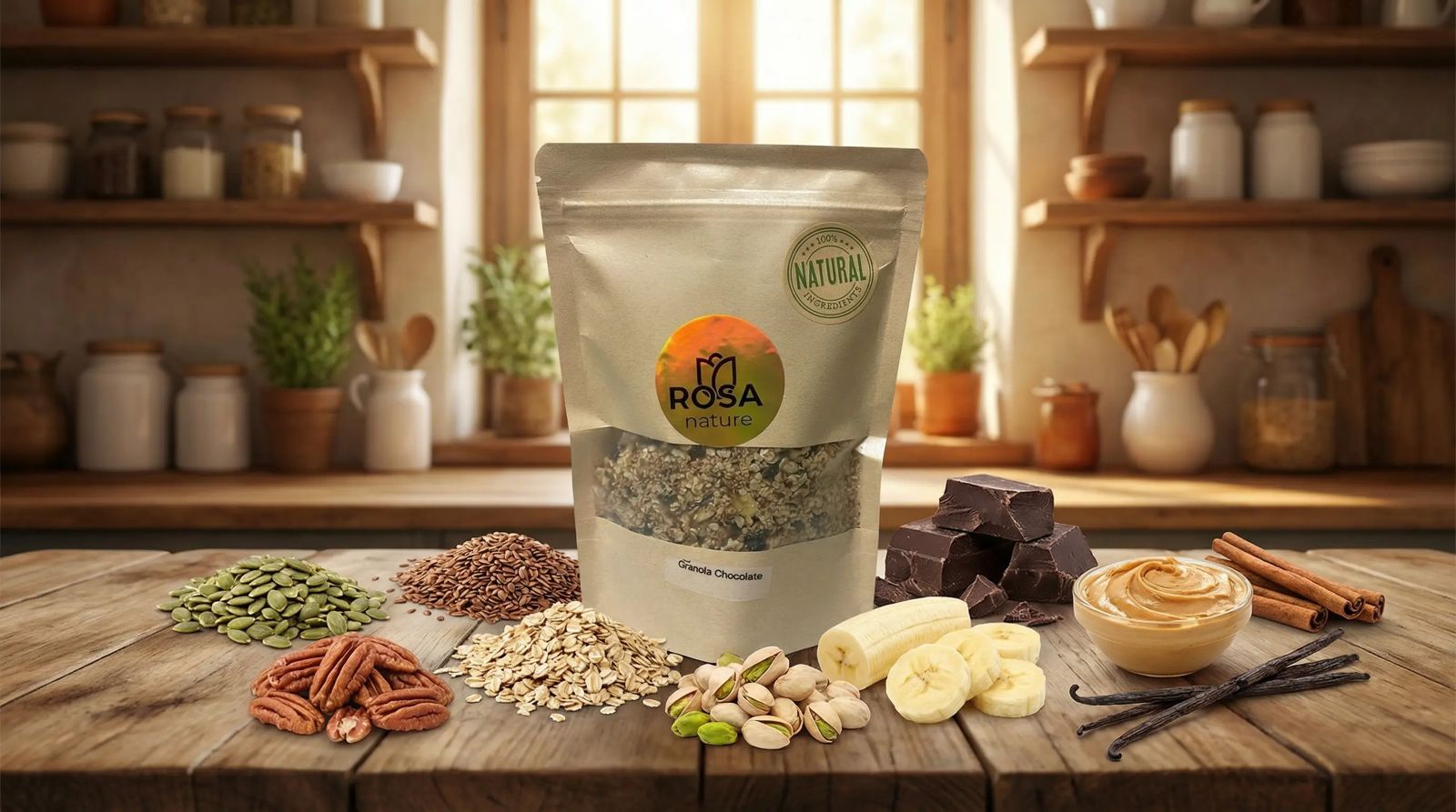 Nuestra granola artesanal de chocolate es para quien quiere un desayuno con carácter: cacao intenso, especias cálidas y textura crujiente.