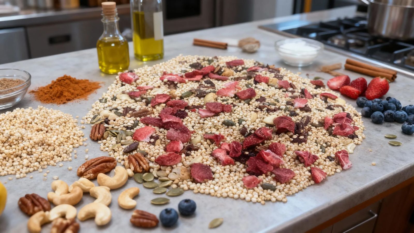 La base de quinoa hinchada aporta ligereza y textura; las pipas de calabaza, anacardo y nueces de pecán suman cuerpo y sabor; y el AOVE (aceite de oliva virgen extra) redondea el tostado con un acabado suave. Cerramos con canela y una mezcla de arándanos y fresas deshidratadas para un contraste dulce–ácido muy agradable.