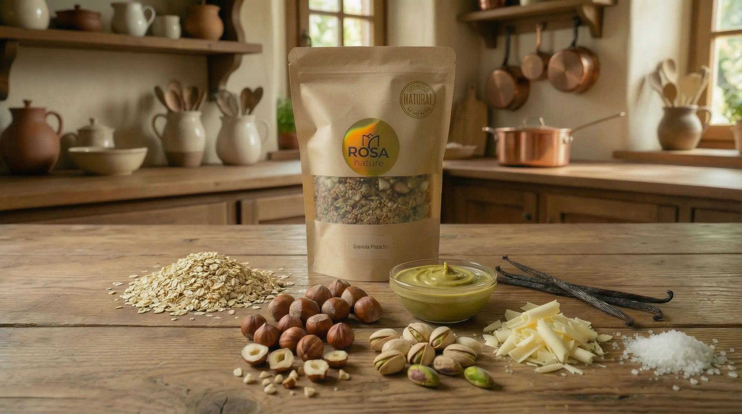 Nuestra granola artesanal de pistacho está pensada para los que buscan un sabor más indulgente y elegante: pistacho protagonista, vainilla redonda y el contraste dulce del chocolate blanco sin azucar.