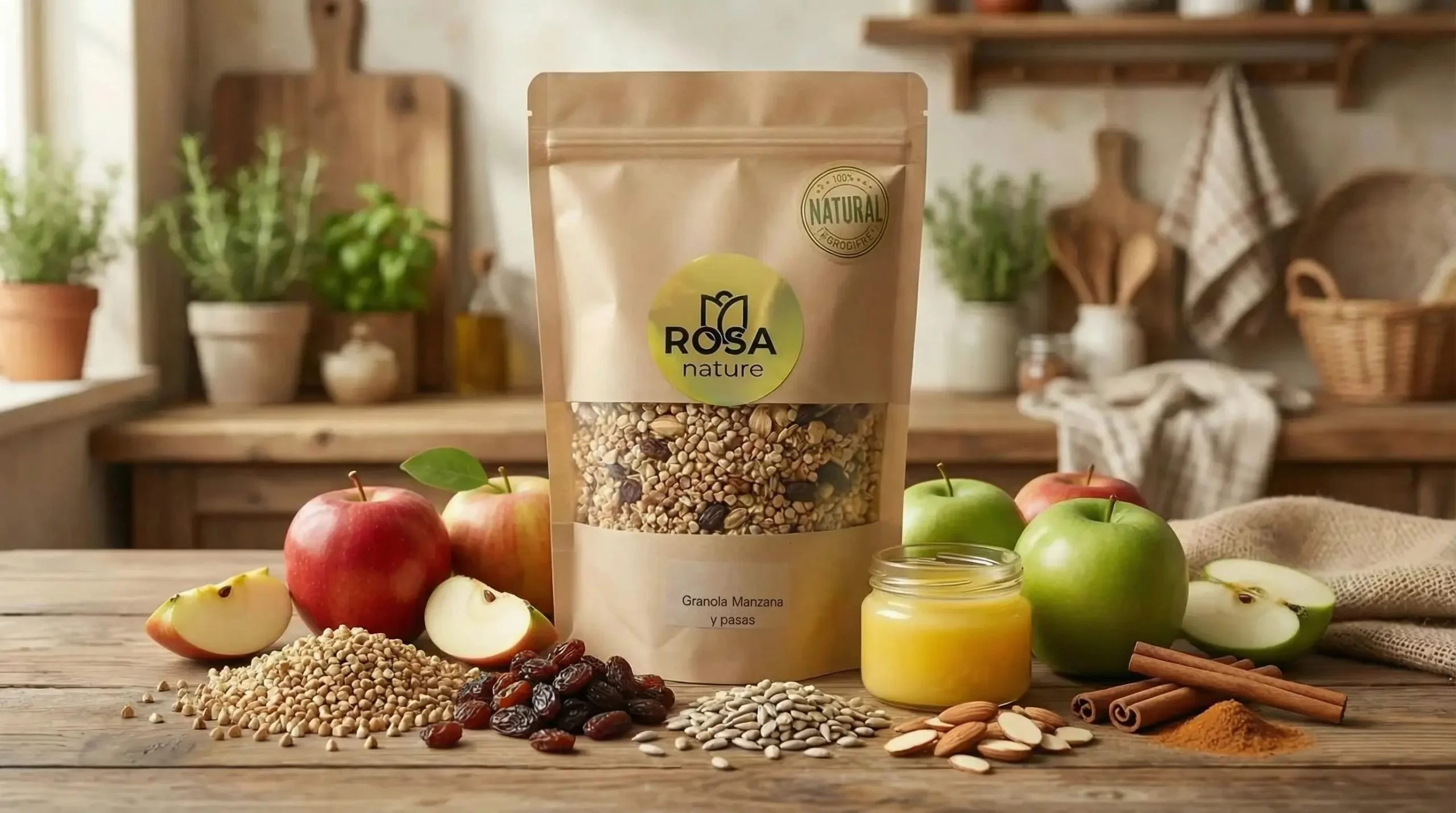 Granola Manzana y Pasas: base de avena sin gluten con compota de manzana artesanal, pasas, almendra laminada, pipas de girasol y ghee bio; un sabor cálido “hogar” con canela.